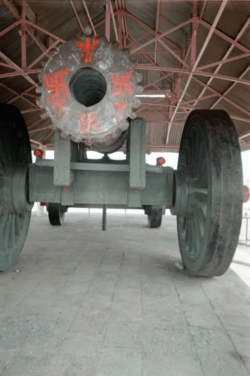 At Jaigarh, the world's largest cannon on wheels, with swastikas painted on